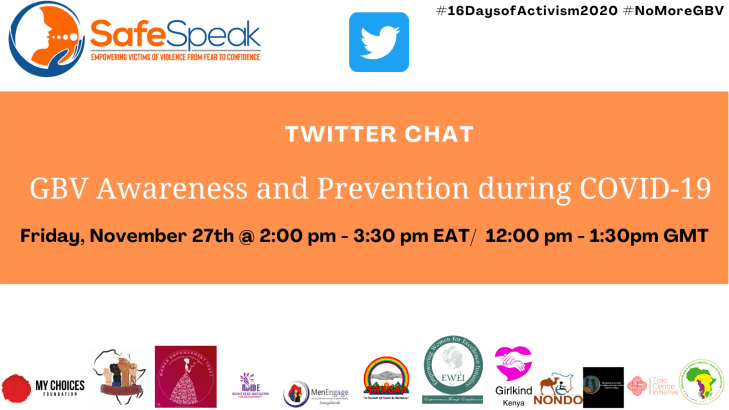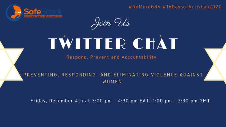 Join us on Friday, 4 December, the 10th day of #16DaysofActivism, for a Twitter Chat on “Preventing, Responding and Eliminating Violence Against Women” at 3:00pm EAT / 1:00pm GMT. Be part of the conversation using #NoMoreGBV #16DaysofActivism2020.