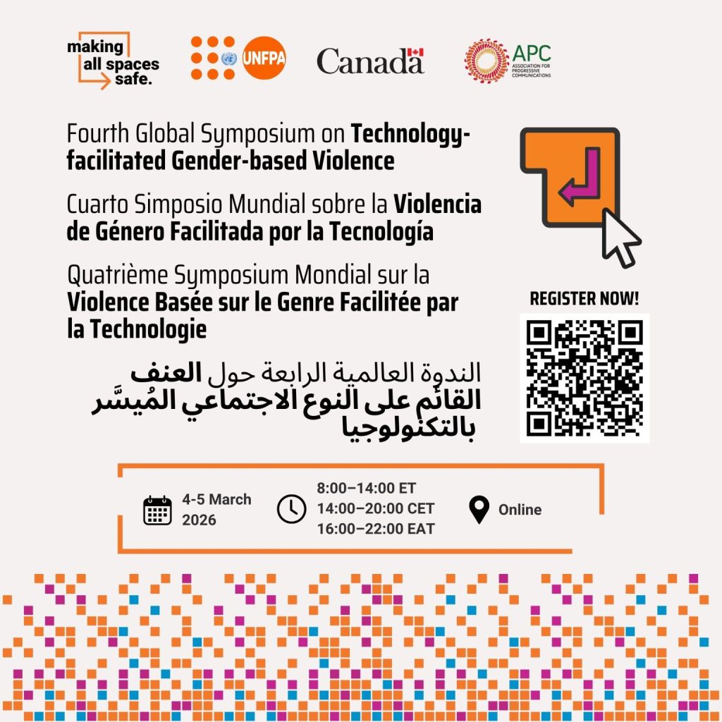 The Fourth Global Symposium on Technology-Facilitated Gender-Based Violence (TFGBV), taking place on 4–5 March 2026, brings together governments, civil society, researchers, digital rights advocates, technology companies and UN partners to address the growing crisis of online gender-based violence. Co-hosted by UNFPA, Global Affairs Canada and the Association for Progressive Communications, the Symposium provides a trusted global space to exchange knowledge and advance survivor-centred, inclusive and accountable responses to technology-facilitated harm.